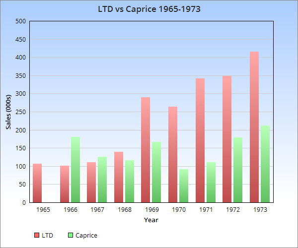 In het licht van deze opkomst reageerde Chevrolet met de Caprice, die zes maanden na de LTD werd gelanceerd. Hoewel de Caprice een goede start kende en de LTD in verkopen overtrof tijdens zijn eerste volledige jaar in 1966, heeft hij nooit hetzelfde niveau van erkenning en succes bereikt. Dit verschil kan worden toegeschreven aan het feit dat Chevrolet zijn naam niet zo snel heeft gedevalueerd als Ford. De cijfers spreken voor zich: de verkoopcurve van de LTD was veel stijgender.
